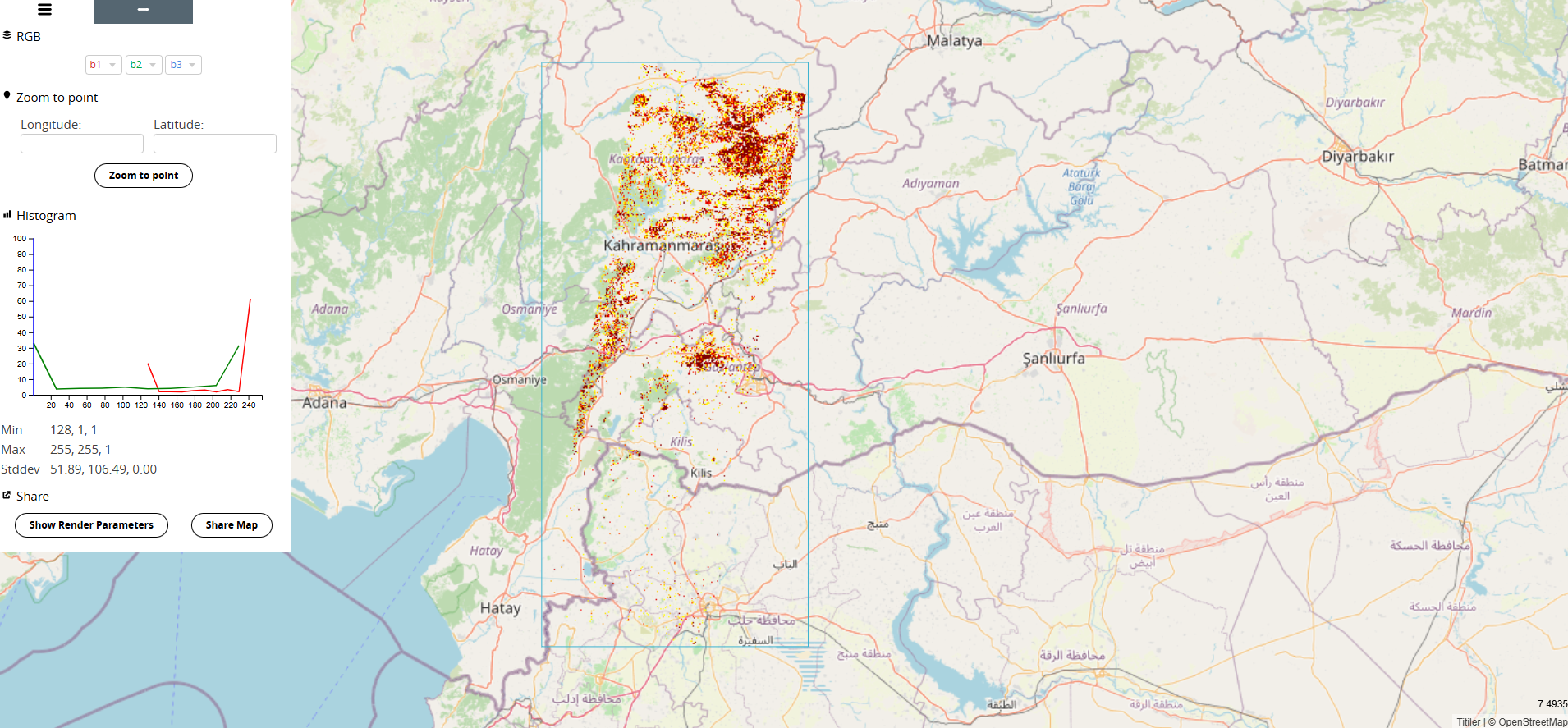 In the below image, we see where to find this information. By selecting one of the dropdown menus highlighted in the red box, you will see how many bands are used in this data. By looking at the information in the blue box, you will see the pixel values that will determine your rescale.