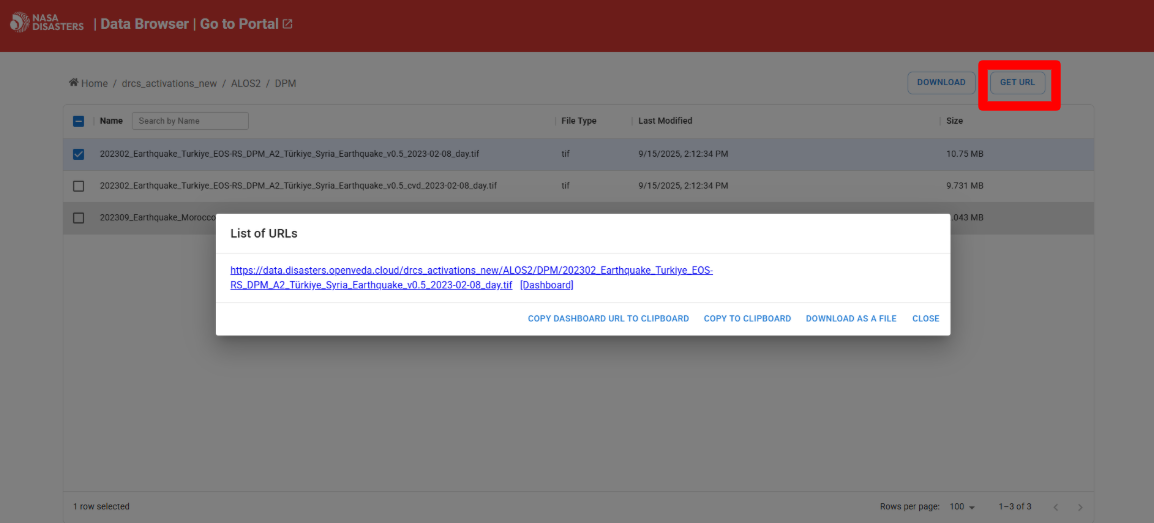 Select one of the files, click GET URL in the upper right corner, and copy the url. Then, you can paste the URL into the prompt when clicking this link: https://dev.openveda.cloud/api/raster/cog/viewer.