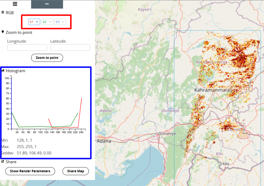 In the below image, we see where to find this information. By selecting one of the dropdown menus highlighted in the red box, you will see how many bands are used in this data. By looking at the information in the blue box, you will see the pixel values that will determine your rescale.