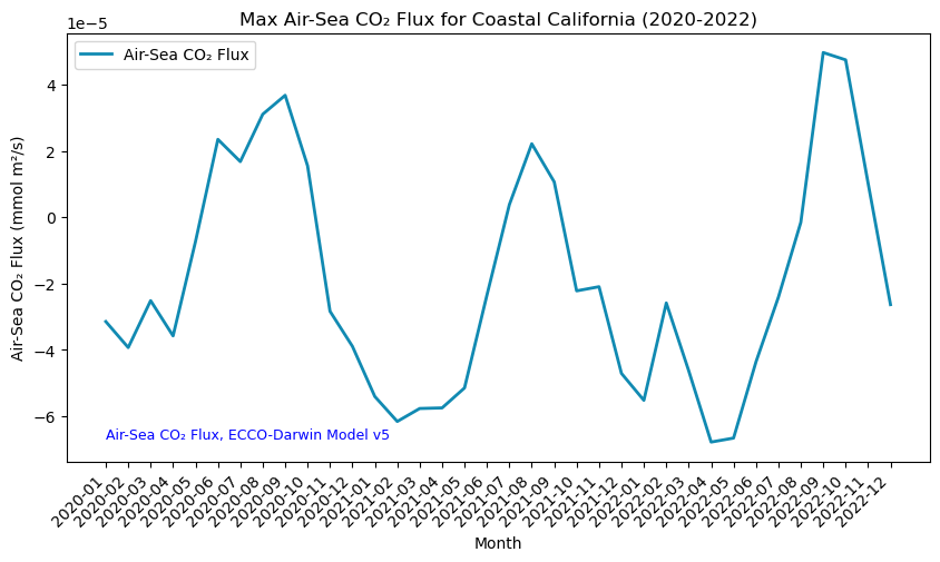 - description "Global, monthly average air-sea CO₂ flux (negative into ocean) at ~1/3° resolution from 2020 to 2022. Data are in units of millimoles of CO₂ per meter squared per second (mmol m²/s). Derived using the ECCO-Darwin model v5, which is an ocean biogeochemical model that assimilates Estimating the Circulation and Climate of the Ocean (ECCO) consortium ocean circulation estimates and biogeochemical processes from the Massachusetts Institute of Technology (MIT) Darwin Project."