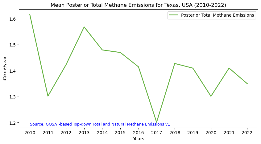 - description "As part of the global stock take (GST), countries are asked to provide a record of their greenhouse gas (GHG) emissions to inform decisions on how to reduce GHG emissions. The NASA Carbon Monitoring System Flux (CMS-Flux) team has used remote sensing observations from Japan's Greenhouse gases Observing SATellite (GOSAT) to produce modeled total methane (CH₄) emissions and uncertainties on a 1 degree by 1 degree resolution grid for the year 2019. The GOSAT data is used in the model to inform total emission estimates, as well as wetland (the primary natural source of methane), and various human-related sources such as fossil fuel extraction, transport, agriculture, waste, and fires. A prior GHG emission estimate (and assocated uncertainty) is provided for each layer, which is the emissions estimate without GOSAT data. The posterior GHG emission layers are informed by GOSAT total column methane data. An advanced mathematical approach is used with a global chemistry transport model to quantify annual CH₄ emissions and uncertainties. These estimates are expressed in teragrams of CH₄ per year (Tg/yr). The source data can be found at https://doi.org/10.5281/zenodo.8306874 and more information can also be found on the CEOS website https://ceos.org/gst/methane.html"