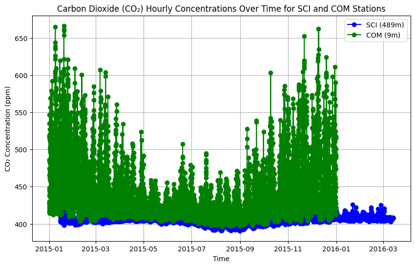 'Carbon Dioxide (CO₂) Hourly Concentrations Over Time for SCI and COM Stations')
