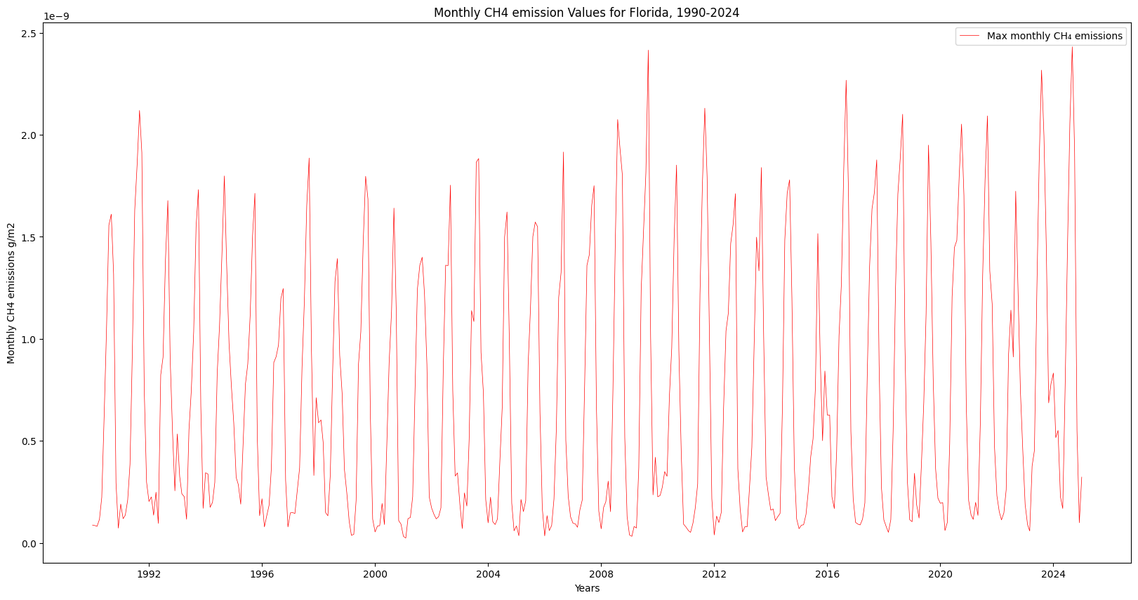 "Monthly CH4 emission Values for Florida, 1990-2024") plt.title(