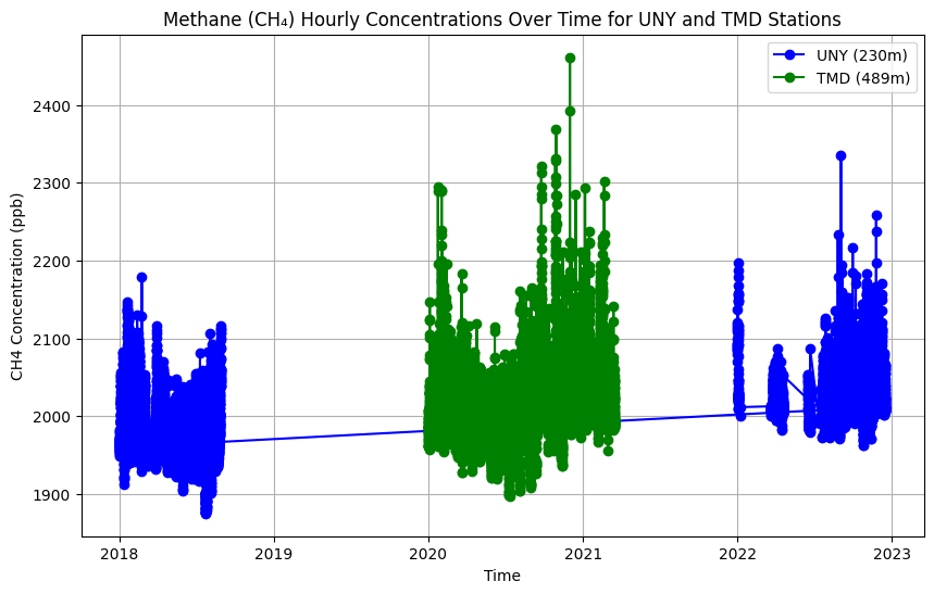 'Methane (CH₄) Hourly Concentrations Over Time for UNY and TMD Stations')
